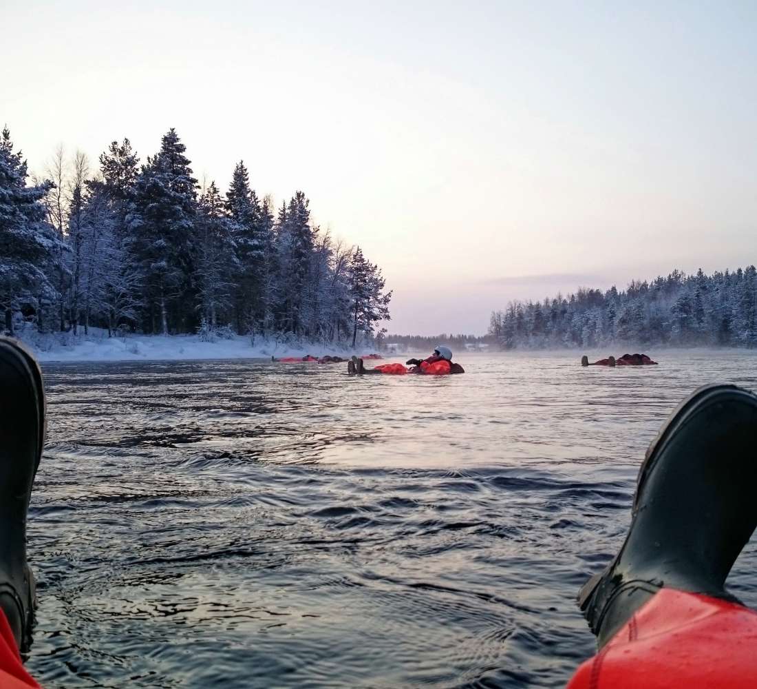 Unvergesslich bleibt auch dieses Outdoor-Abenteuer: Beim River-Floating lässt man sich wie eine Eisscholle in einem dick wattierten Schwimmanzug im eiskalten Wasser treiben. Angeln bei klirrender Kälte – auch das geht in Ruka-Kuusamo. Welche Tricks man beim Eisfischen beachten sollte, zeigt der Guide bei einem Ausflug auf der vielen gefrorenen Seen.